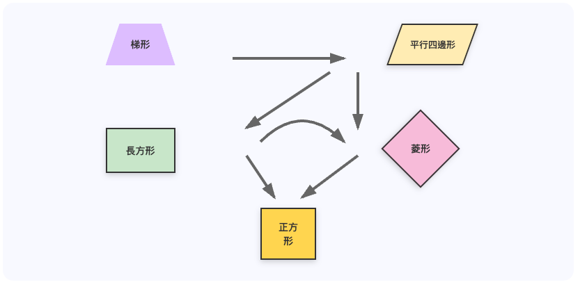 四邊形變換關係網裡,每種圖形按其字面意義顯示,而不是同一的圓角框