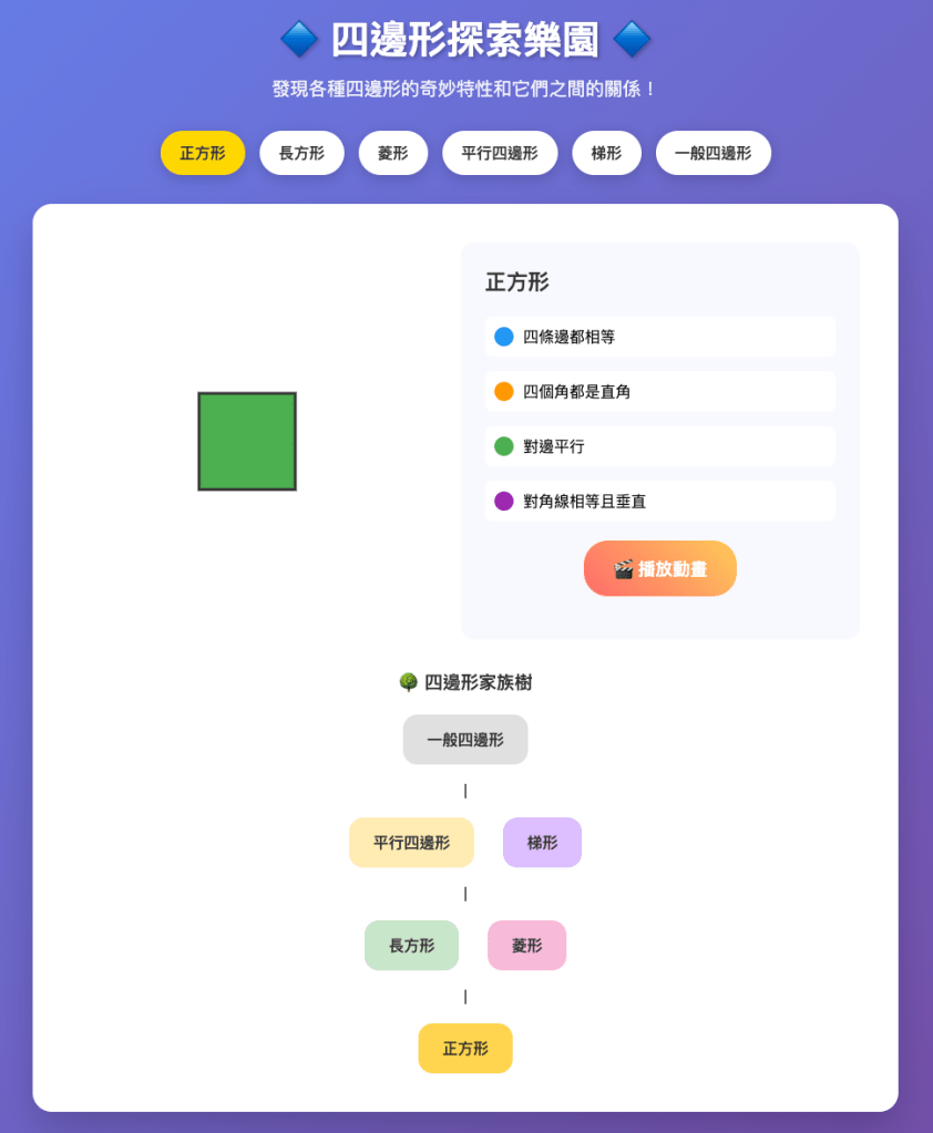 製作一個讓小學生理解各種四邊形的動畫,展現這些形狀特性的聯繫