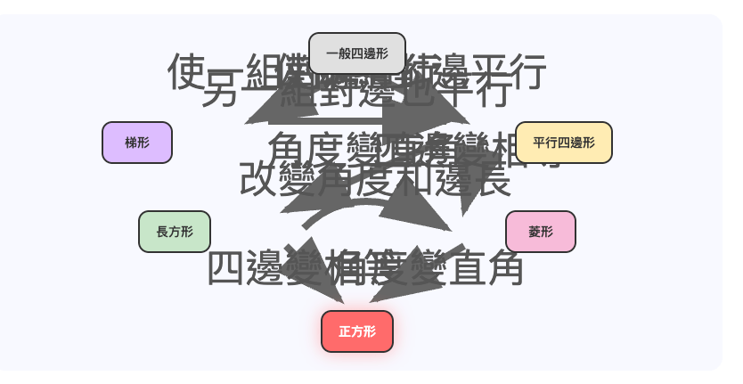 讓用戶可以改變箭頭的方向,增加相反方向的變化的說明,說明文字裡不用再提示變化本身,直接說變化的內容,比如「平行四邊形 → 長方形: 將平行四邊形的角度都變為直角,就成為長方形」,不用顯示「平行四邊形 → 長方形」