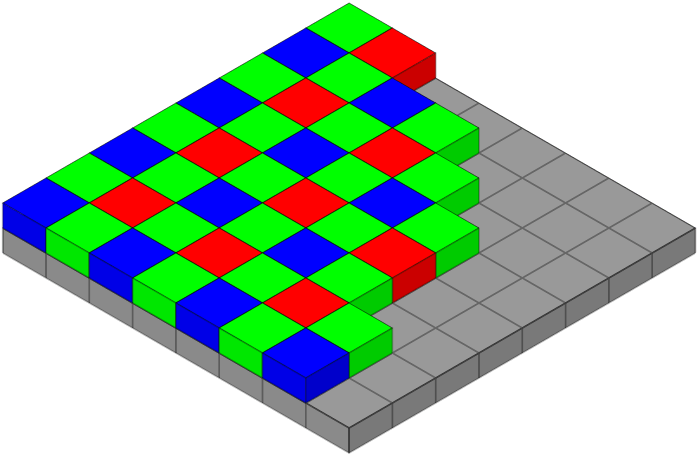 这是一个相机感光芯片的模型图,上层蓝、绿、红色的小方块叫「拜耳滤镜」,可以过滤特定颜色的光,下层灰色的方块,就是我们经常讲的「像素」对应的感光颗粒。所以,所有彩色相机拍摄照片,其实都是要用4个像素分别获得不同颜色的光的亮度,然后再通过计算得到这个位置上的颜色。